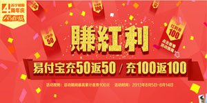 2013年8月5日至8月14日,蘇寧易購(gòu)4周年店慶賺紅利,開通快捷支付的蘇寧易購(gòu)用戶充值易付寶滿50元返50元(滿500元可用)、滿100元返100元(滿1000元可用)紅利券,活動(dòng)期間高可返100元。
