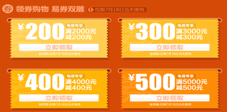 易迅網(wǎng)現(xiàn)在還可以領取滿300減20、滿500減30、滿1000減50和滿3000減100四種額度的優(yōu)惠券,有效期截至7月19日12:00,可用于手機、數(shù)碼、家電百貨、家紡等品類商品。