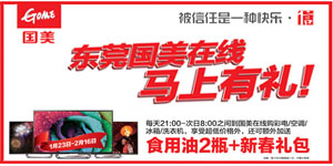 國美在線東莞用戶新春購物送好禮!每天晚上21:00點(diǎn)-次日8:00點(diǎn)間在國美在線下單購買購買冰箱/洗衣機(jī)/空調(diào)/彩電等大家電,配送地址為東莞市區(qū)域的用戶除了可獲額外獲贈(zèng)食用油2瓶+新春大禮包。活動(dòng)期間,用戶還可同時(shí)享受國美在線的超低折扣,東莞市區(qū)域的朋友不妨去看看吧!